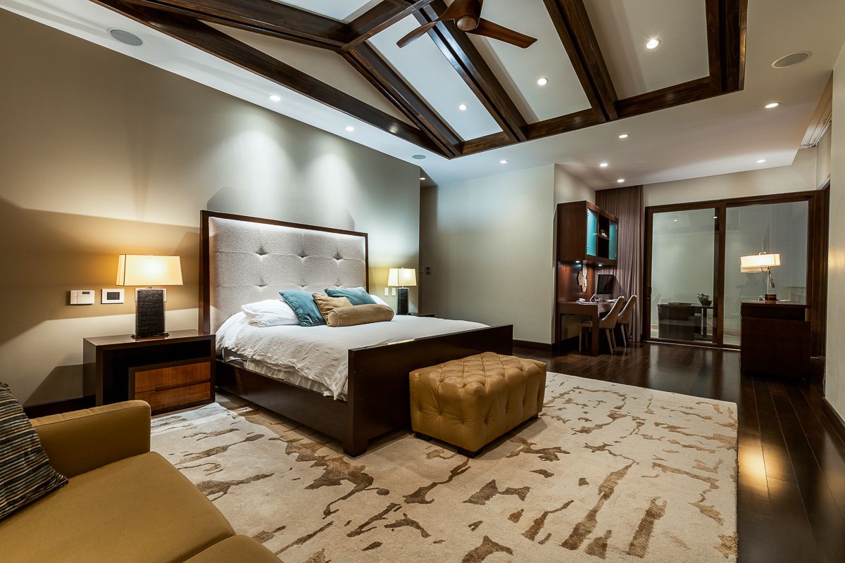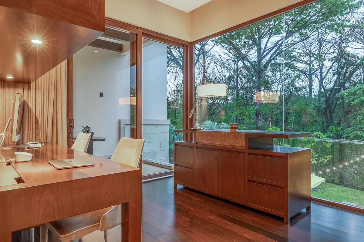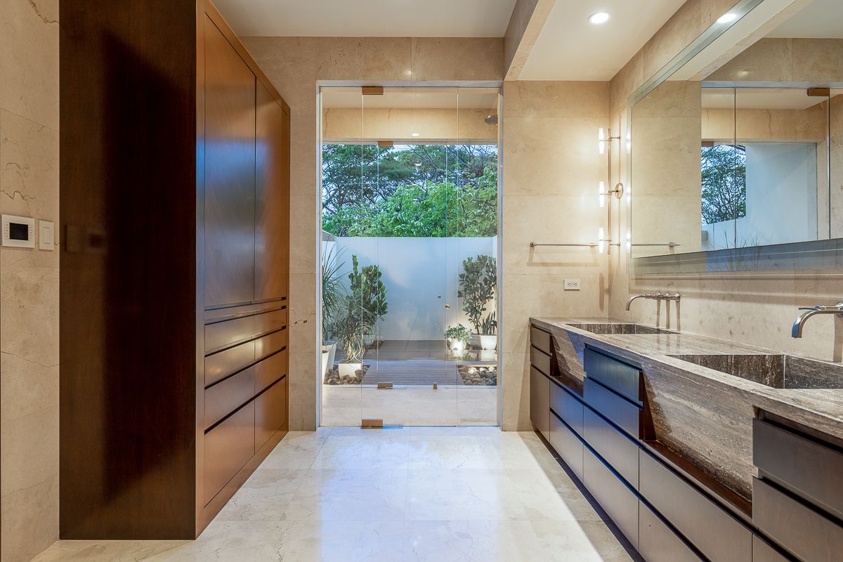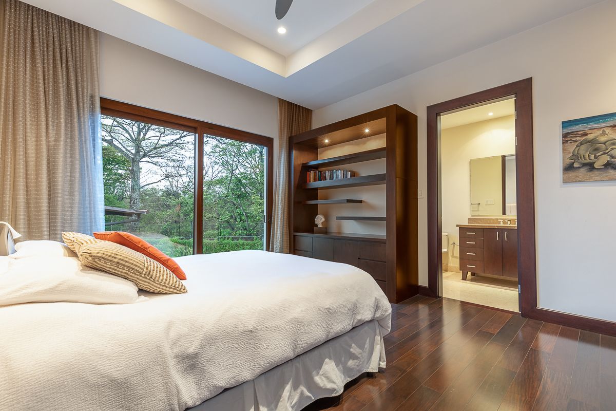 On the second level, there are three secondary bedrooms and a luxurious master bedroom all with walk-in closet and bathroom. All bedrooms are accessed from a comfortable and cozy audio and TV room. The master bedroom is large enough to accommodate a desk and a covered balcony. The bathroom has two sinks, separate toilet, shower, tub and an outdoor shower designed to enjoy nature at its best. All are with marble countertops, floors and walls. The walk-in closet is extremely spacious with a central island to prepare travel bags. All rooms have a spectacular view of the gardens. The wood installed throughout the second floor absorbs noise.