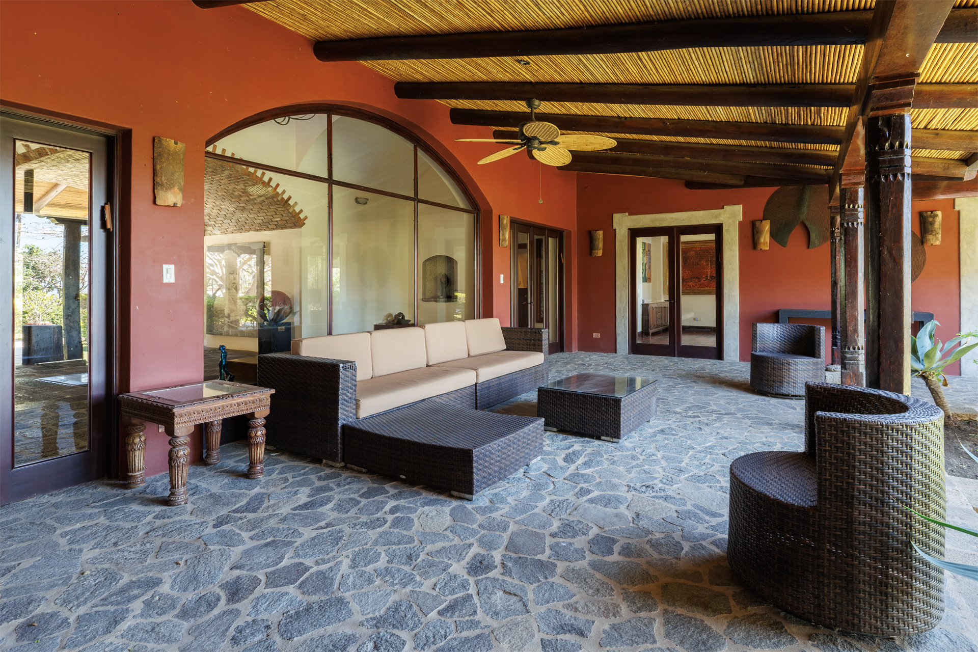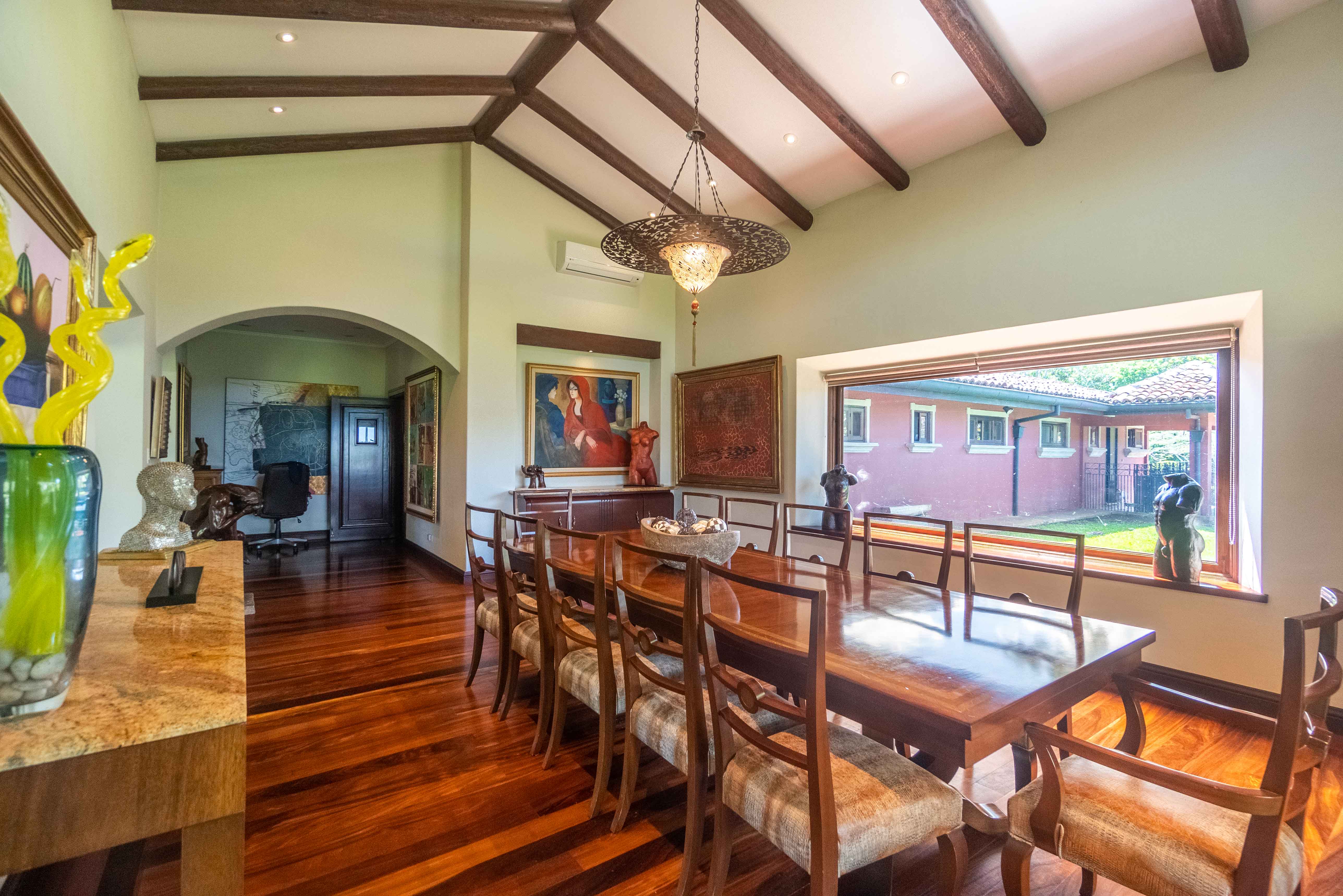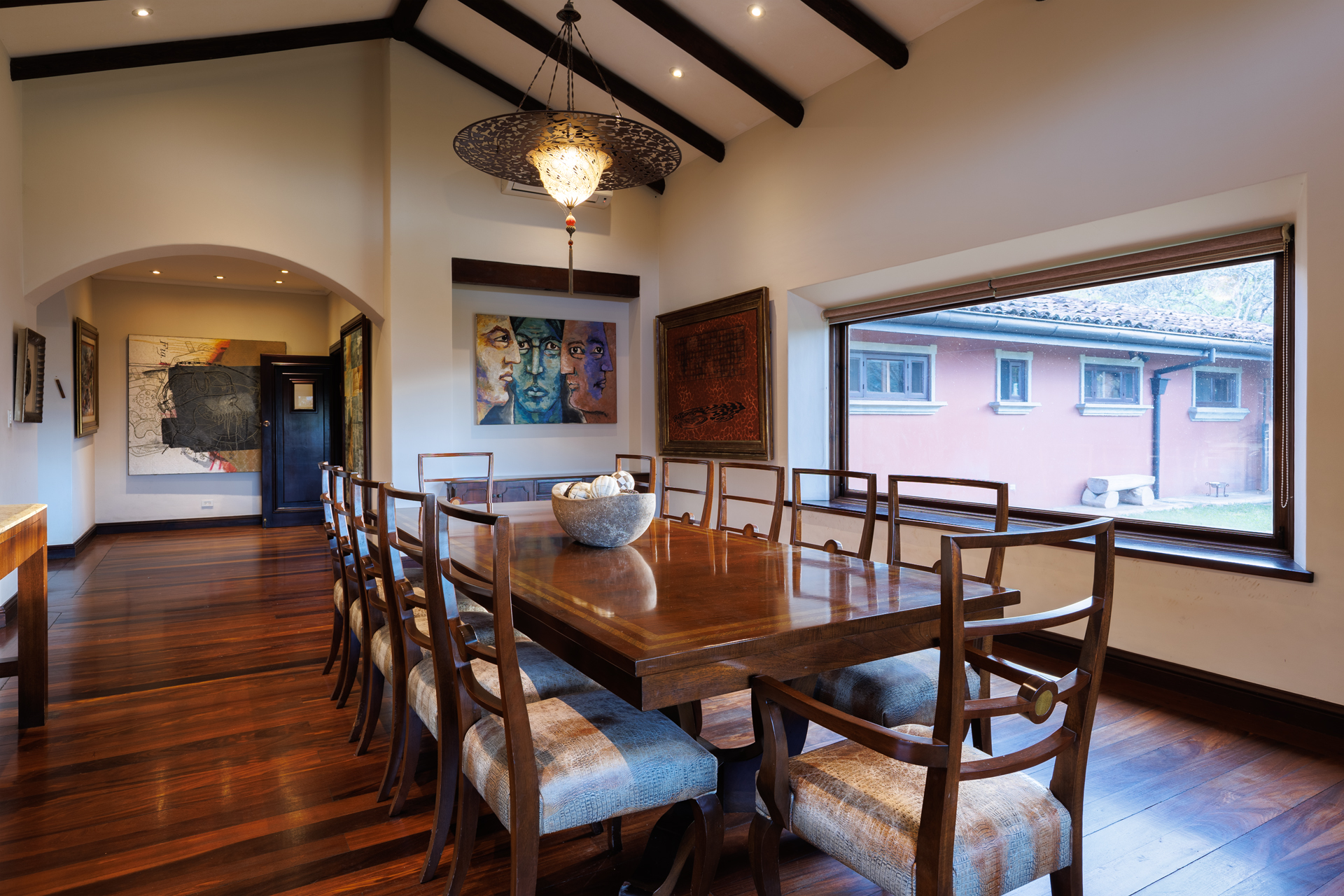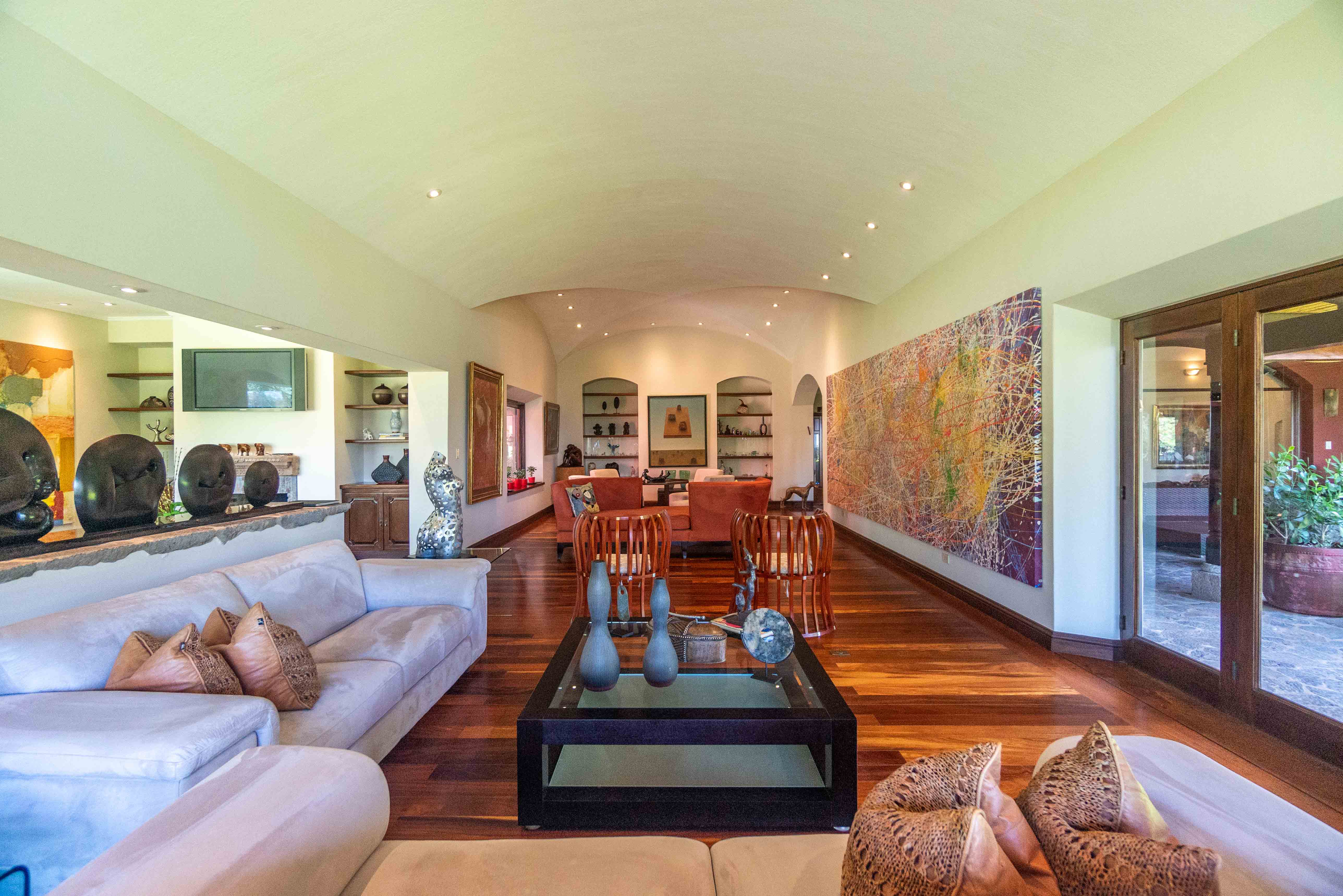 The architectural design pays homage to timeless Spanish colonial tradition, featuring terracotta roof tiles, vaulted ceilings, and artisan-crafted finishes throughout. Interiors flow effortlessly through a central courtyard and elegant hallways finished with stone, wood, and ironwork, each space revealing meticulous craftsmanship. The villa's main living areas are bright and open, framed by floor to ceiling windows and doors that invite nature inward. Wide corridors and gallery-style walls serve as the perfect canvas for a curated art collection, while warm hardwood floors and exposed beams create an atmosphere of elegance and comfort.
