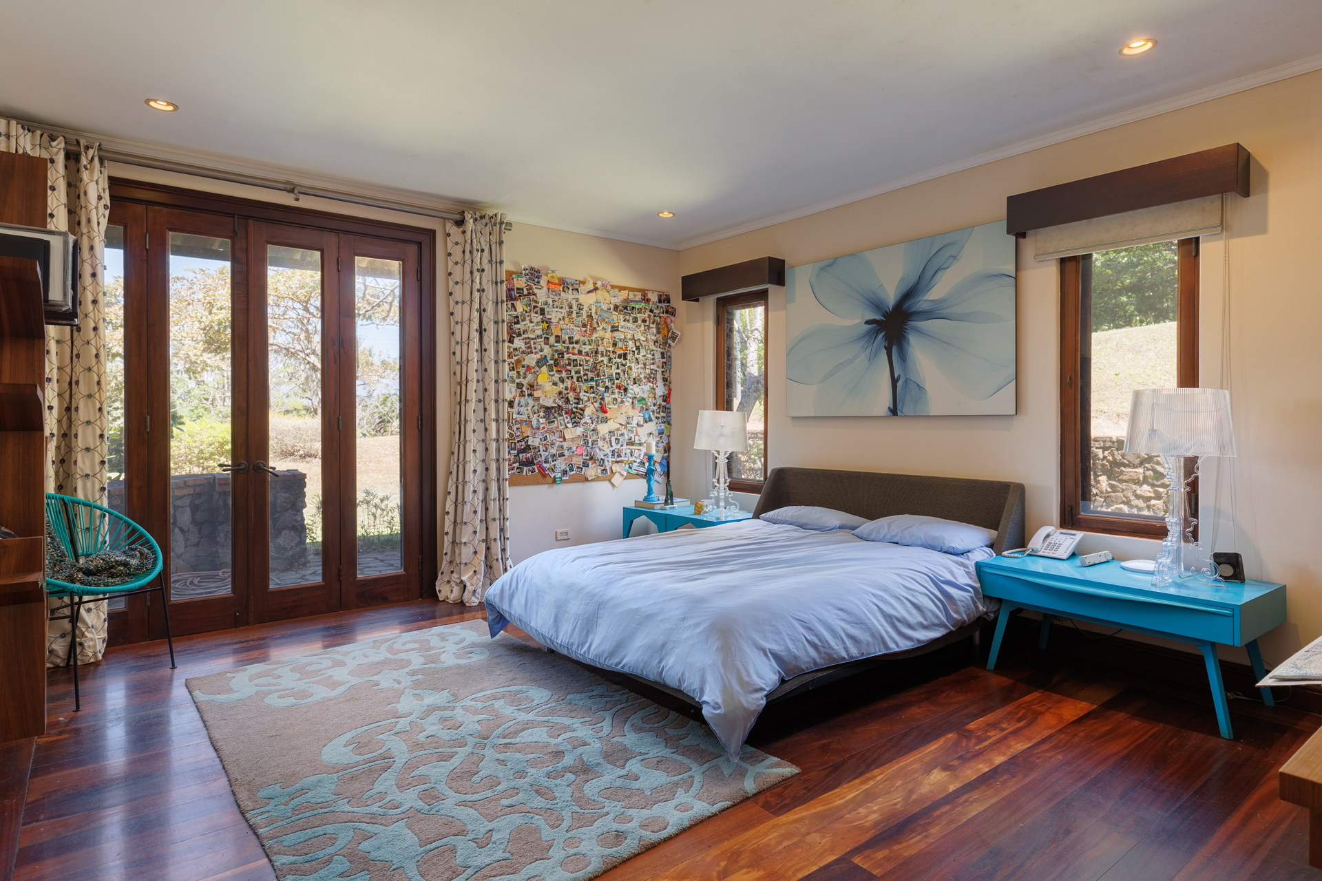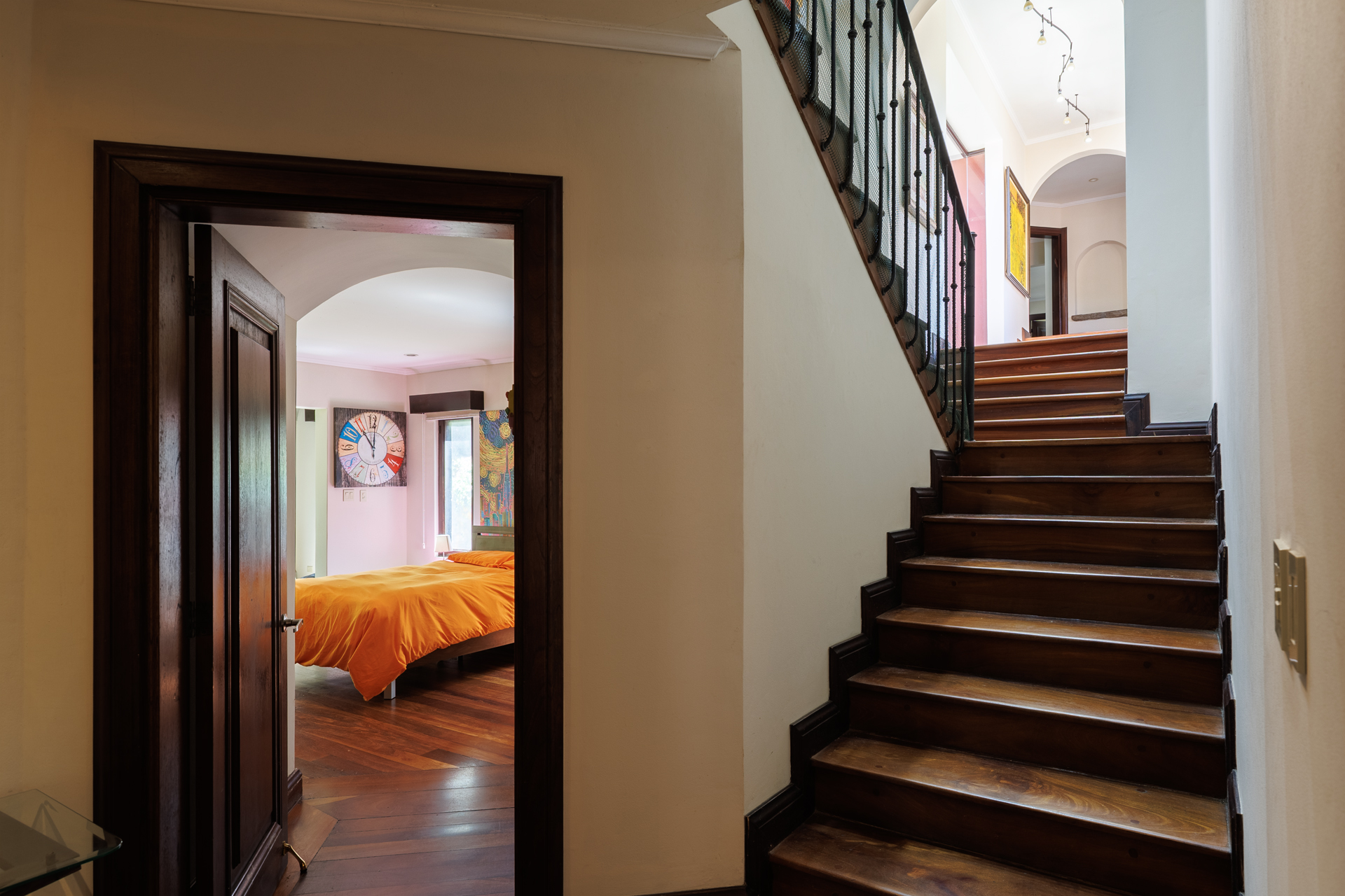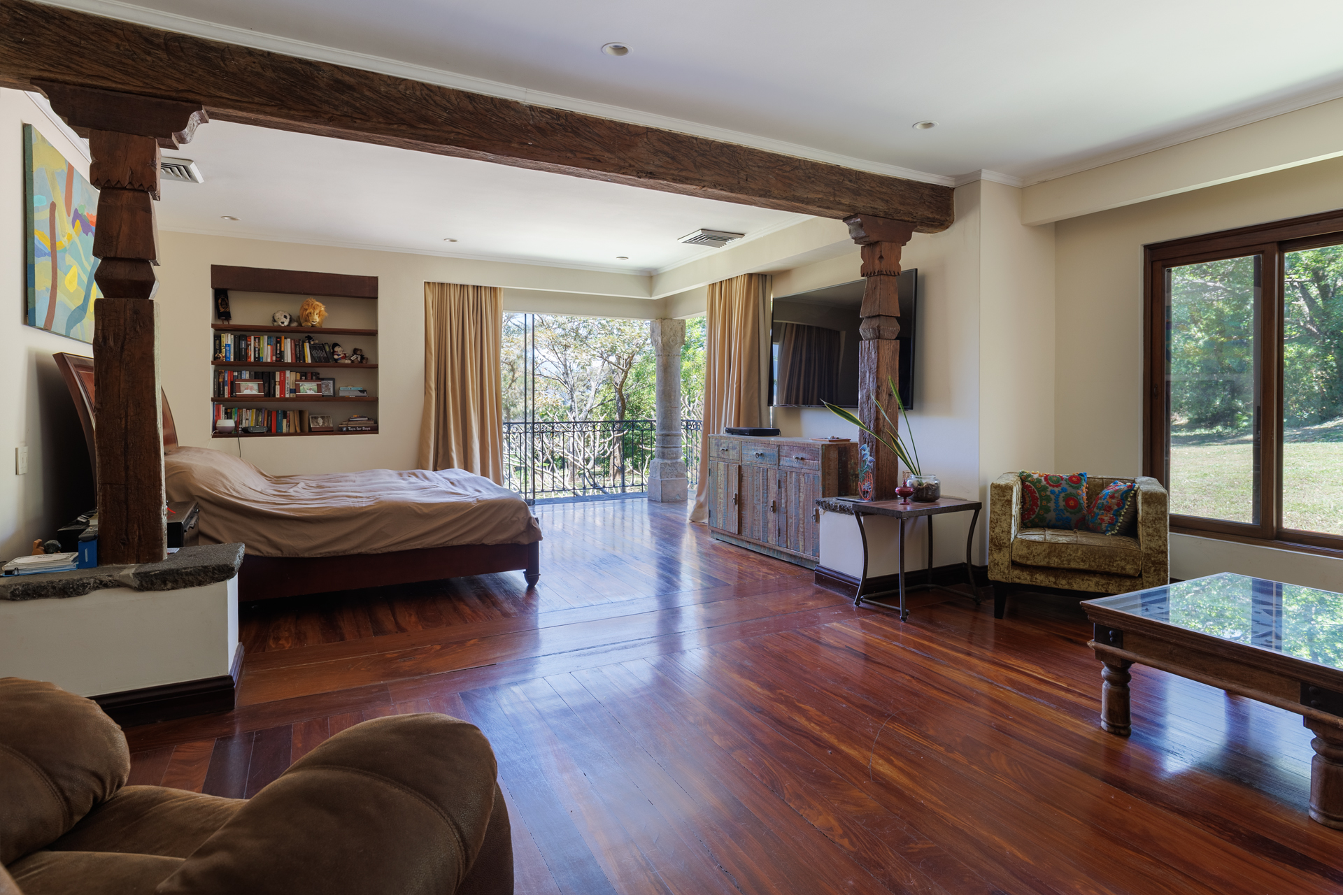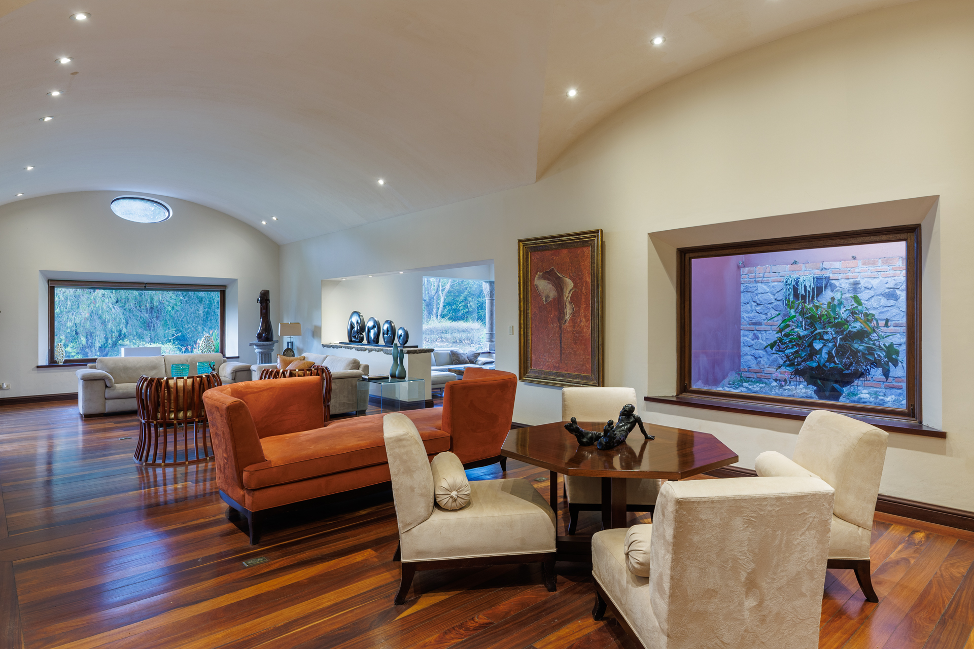 The architectural design pays homage to timeless Spanish colonial tradition, featuring terracotta roof tiles, vaulted ceilings, and artisan-crafted finishes throughout. Interiors flow effortlessly through a central courtyard and elegant hallways finished with stone, wood, and ironwork, each space revealing meticulous craftsmanship. The villa's main living areas are bright and open, framed by floor to ceiling windows and doors that invite nature inward. Wide corridors and gallery-style walls serve as the perfect canvas for a curated art collection, while warm hardwood floors and exposed beams create an atmosphere of elegance and comfort.
