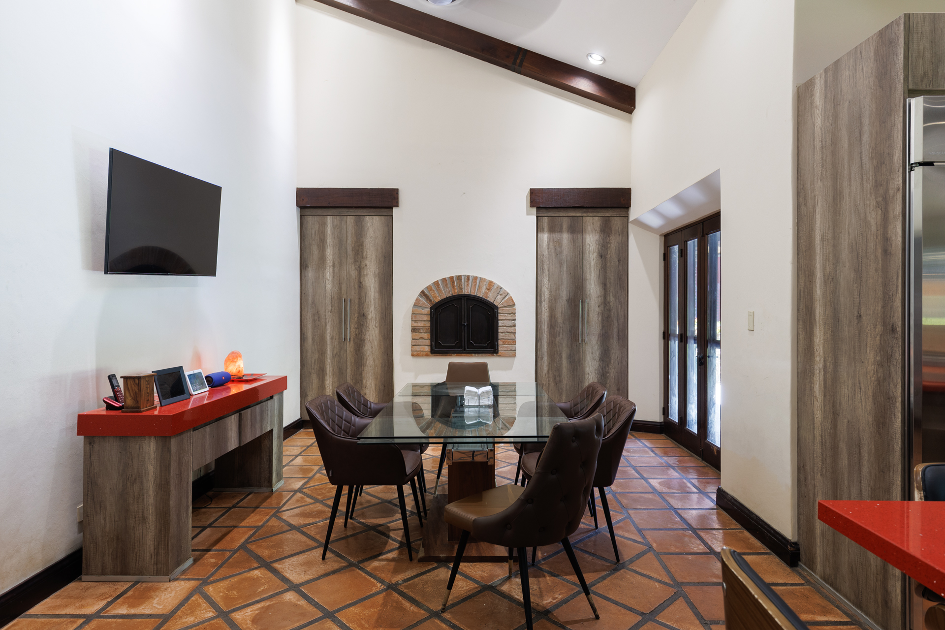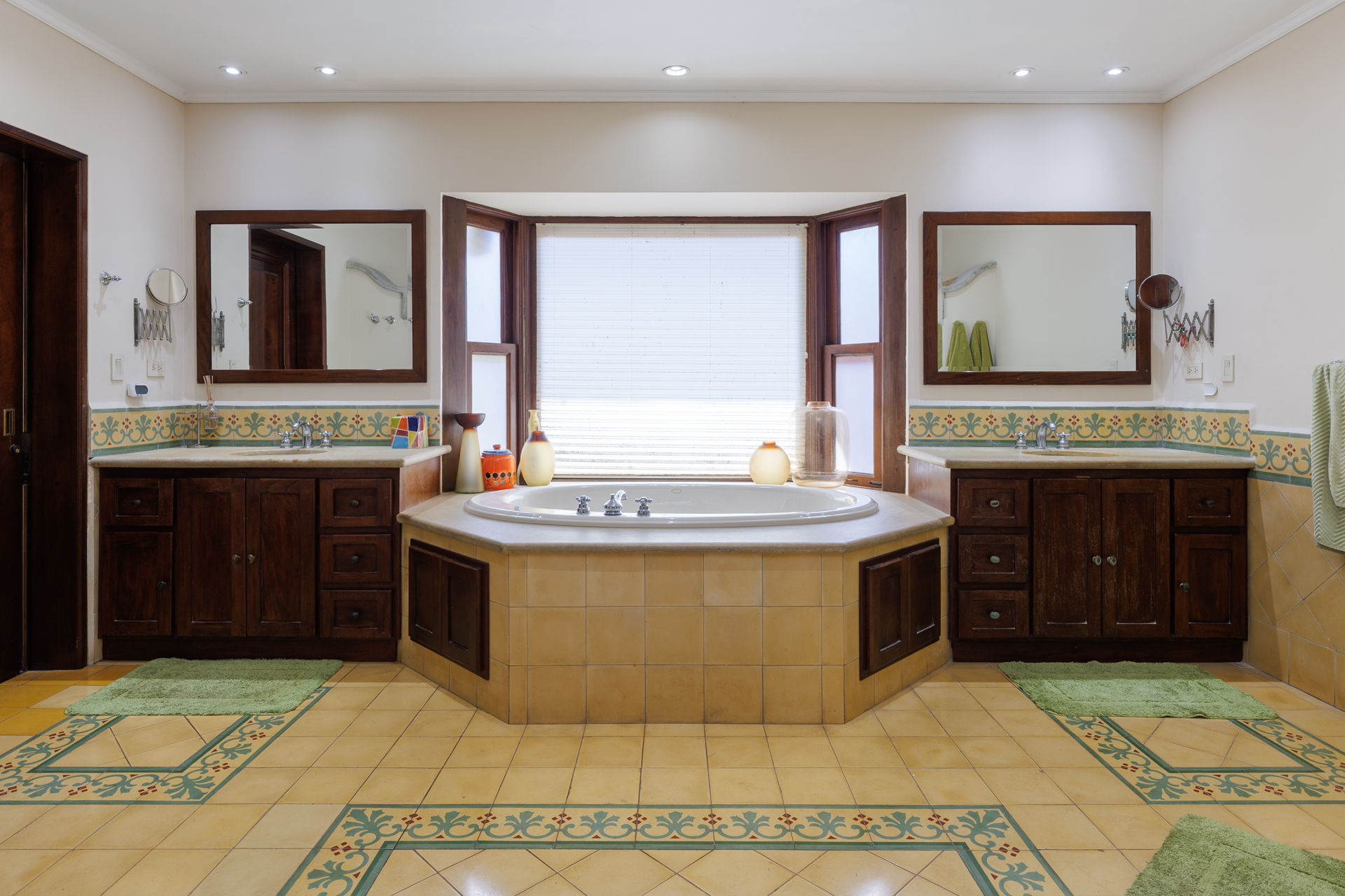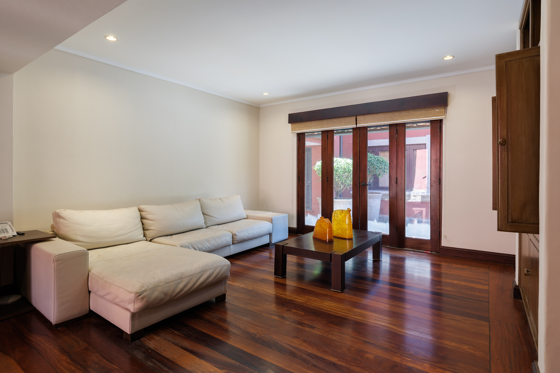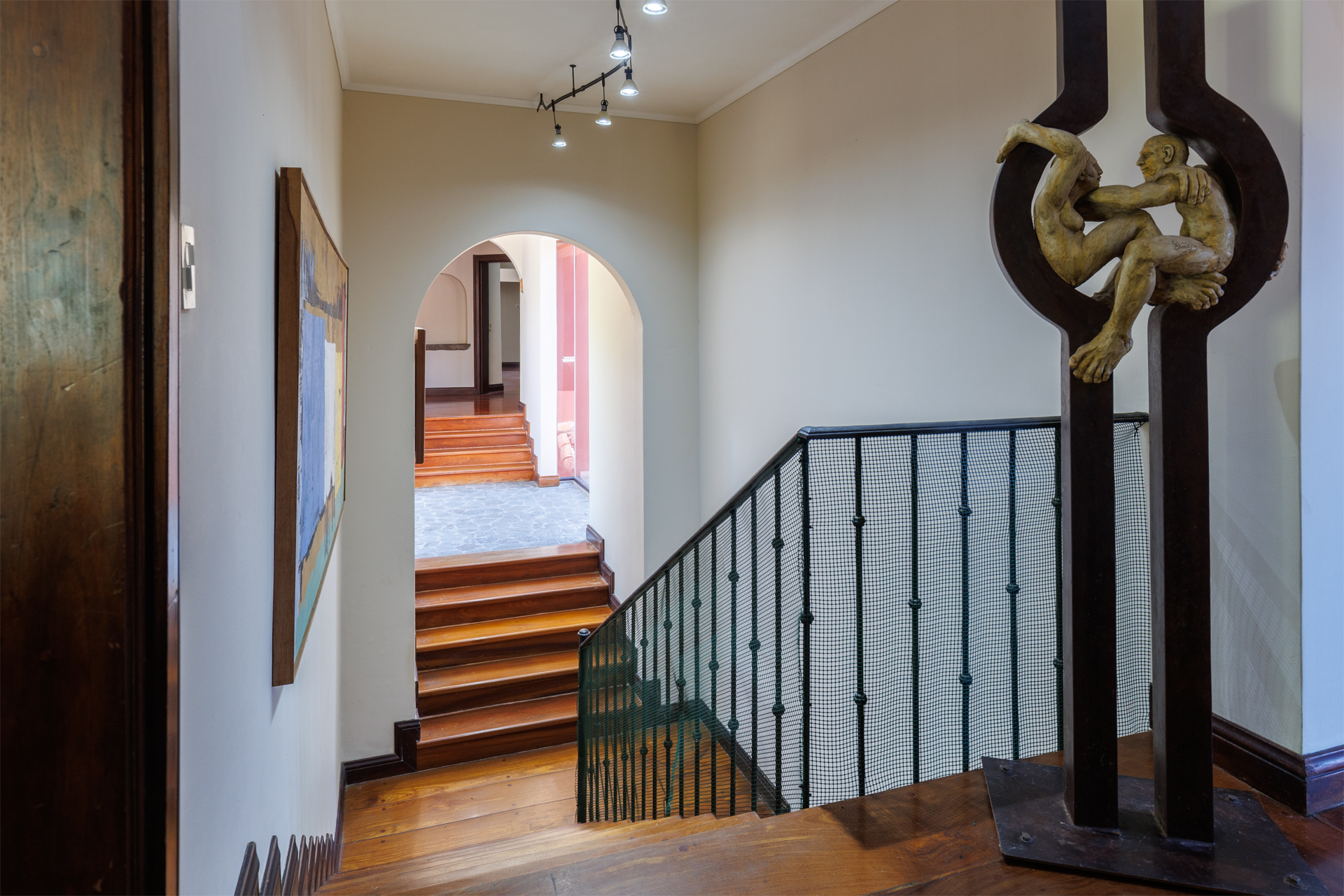 The architectural design pays homage to timeless Spanish colonial tradition, featuring terracotta roof tiles, vaulted ceilings, and artisan-crafted finishes throughout. Interiors flow effortlessly through a central courtyard and elegant hallways finished with stone, wood, and ironwork, each space revealing meticulous craftsmanship. The villa's main living areas are bright and open, framed by floor to ceiling windows and doors that invite nature inward. Wide corridors and gallery-style walls serve as the perfect canvas for a curated art collection, while warm hardwood floors and exposed beams create an atmosphere of elegance and comfort.