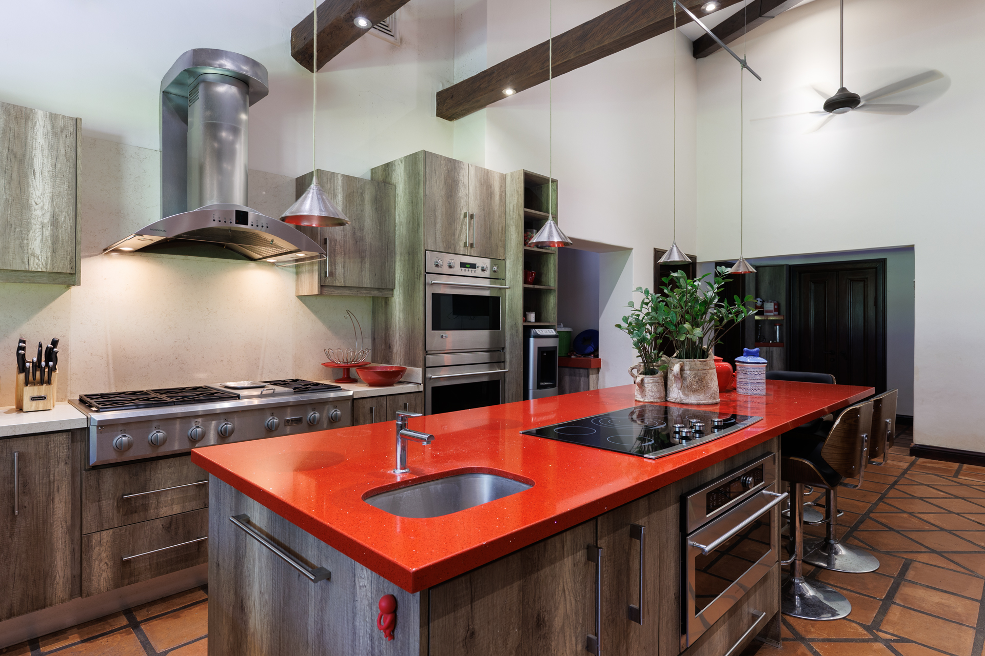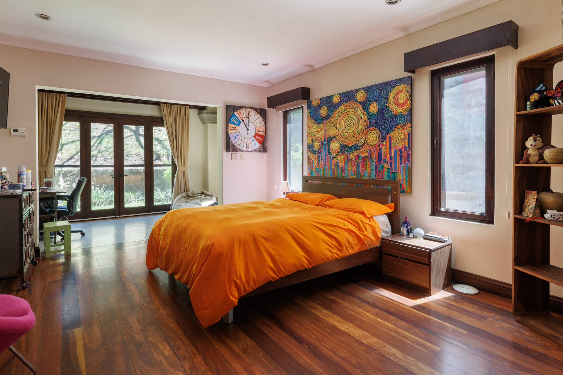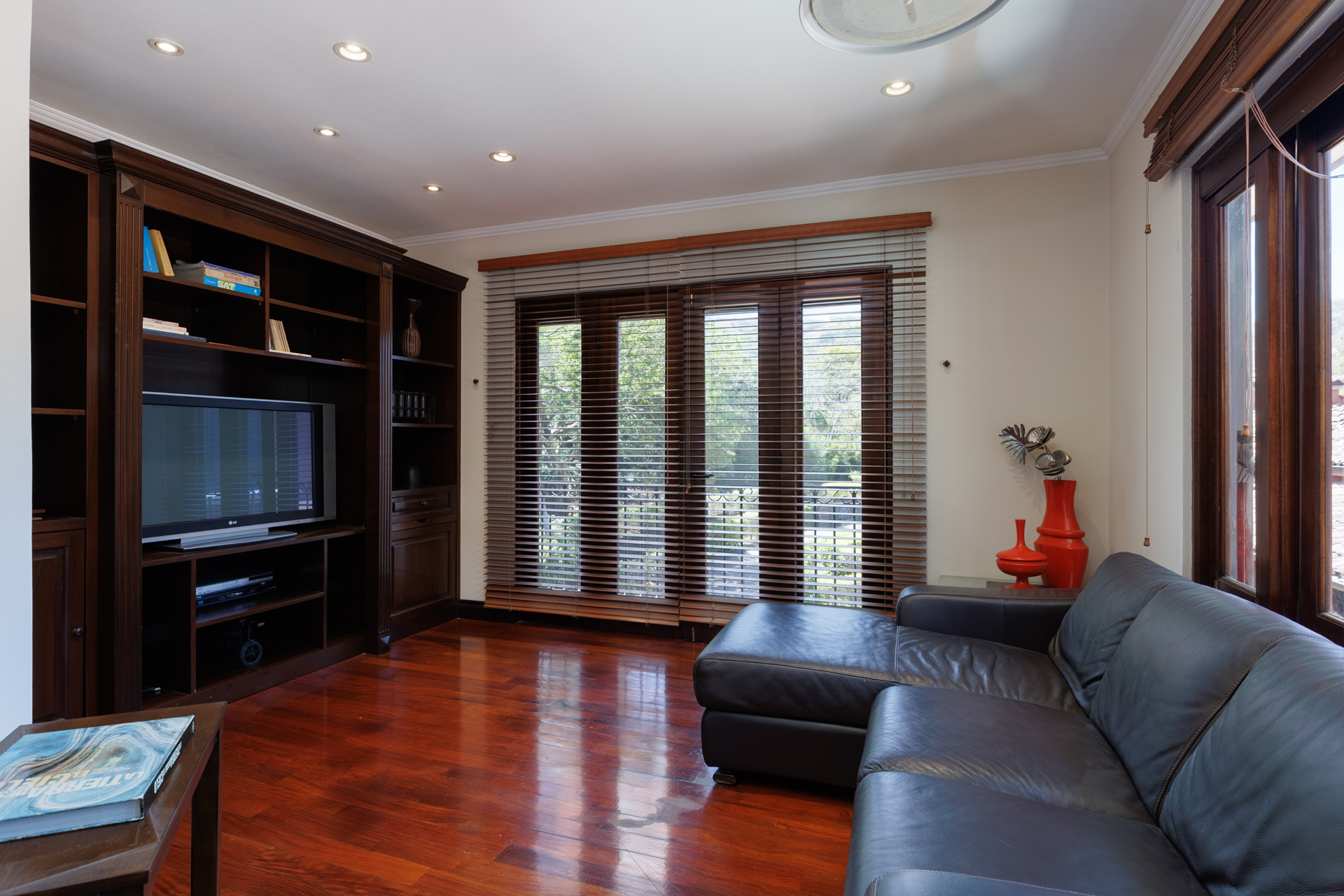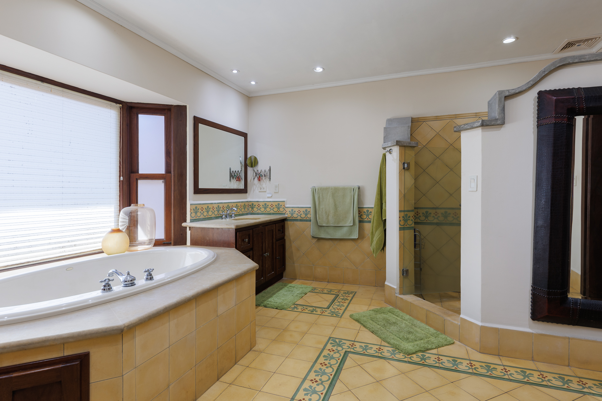 The architectural design pays homage to timeless Spanish colonial tradition, featuring terracotta roof tiles, vaulted ceilings, and artisan-crafted finishes throughout. Interiors flow effortlessly through a central courtyard and elegant hallways finished with stone, wood, and ironwork, each space revealing meticulous craftsmanship. The villa's main living areas are bright and open, framed by floor to ceiling windows and doors that invite nature inward. Wide corridors and gallery-style walls serve as the perfect canvas for a curated art collection, while warm hardwood floors and exposed beams create an atmosphere of elegance and comfort.
