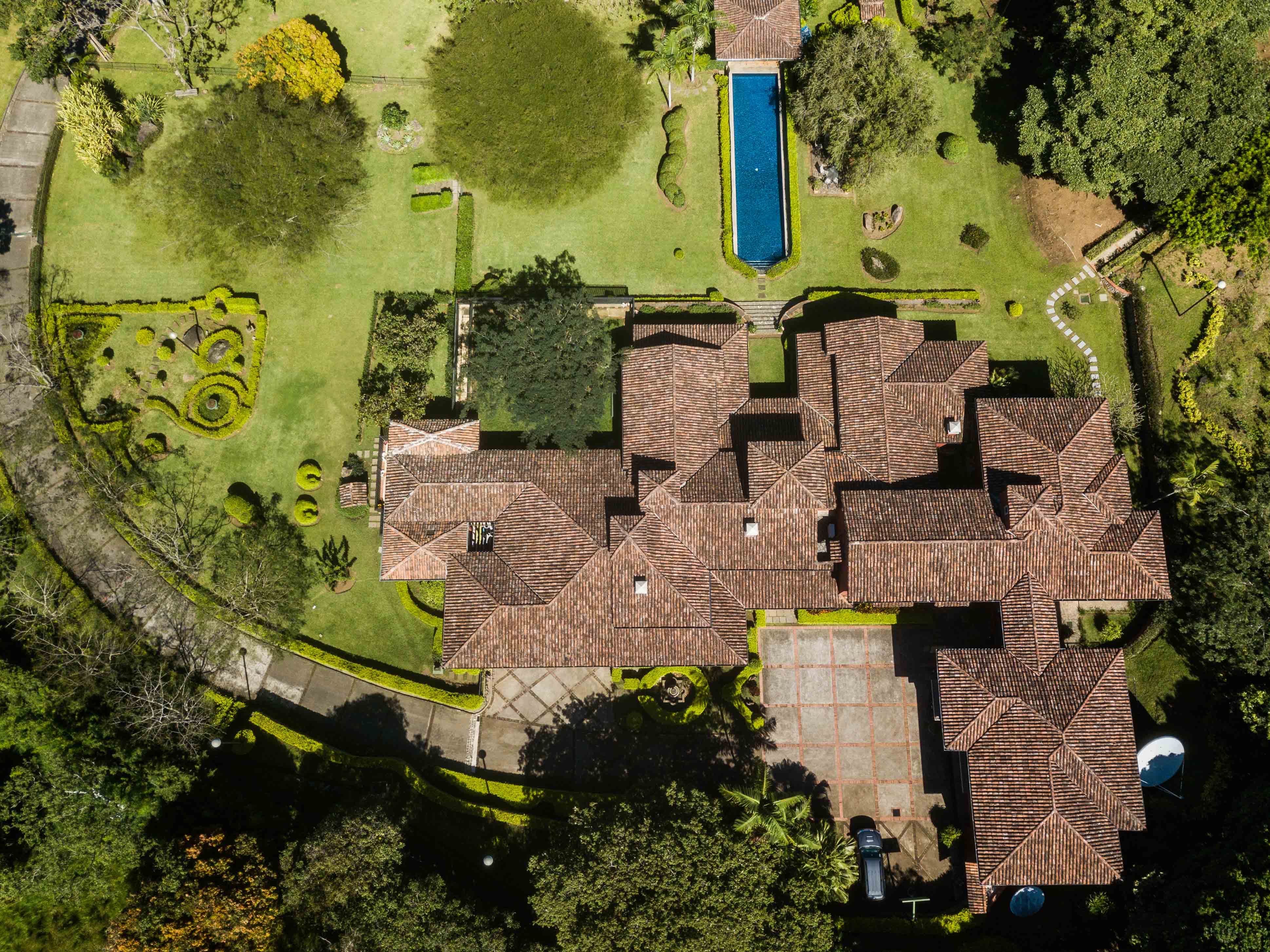 At the heart of the property, a classic swimming pool extends into the landscape, bordered by mature trees, sculpted hedges, and a covered lounge area ideal for year-round enjoyment. The grounds are as functional as they are beautiful, with three staff quarters, ample laundry area, large dog kennels, and covered parking for four vehicles discretely integrated into the layout, plus ample parking areas for guests. The villa also includes its own guard gate with a private bathroom and kitchenette.