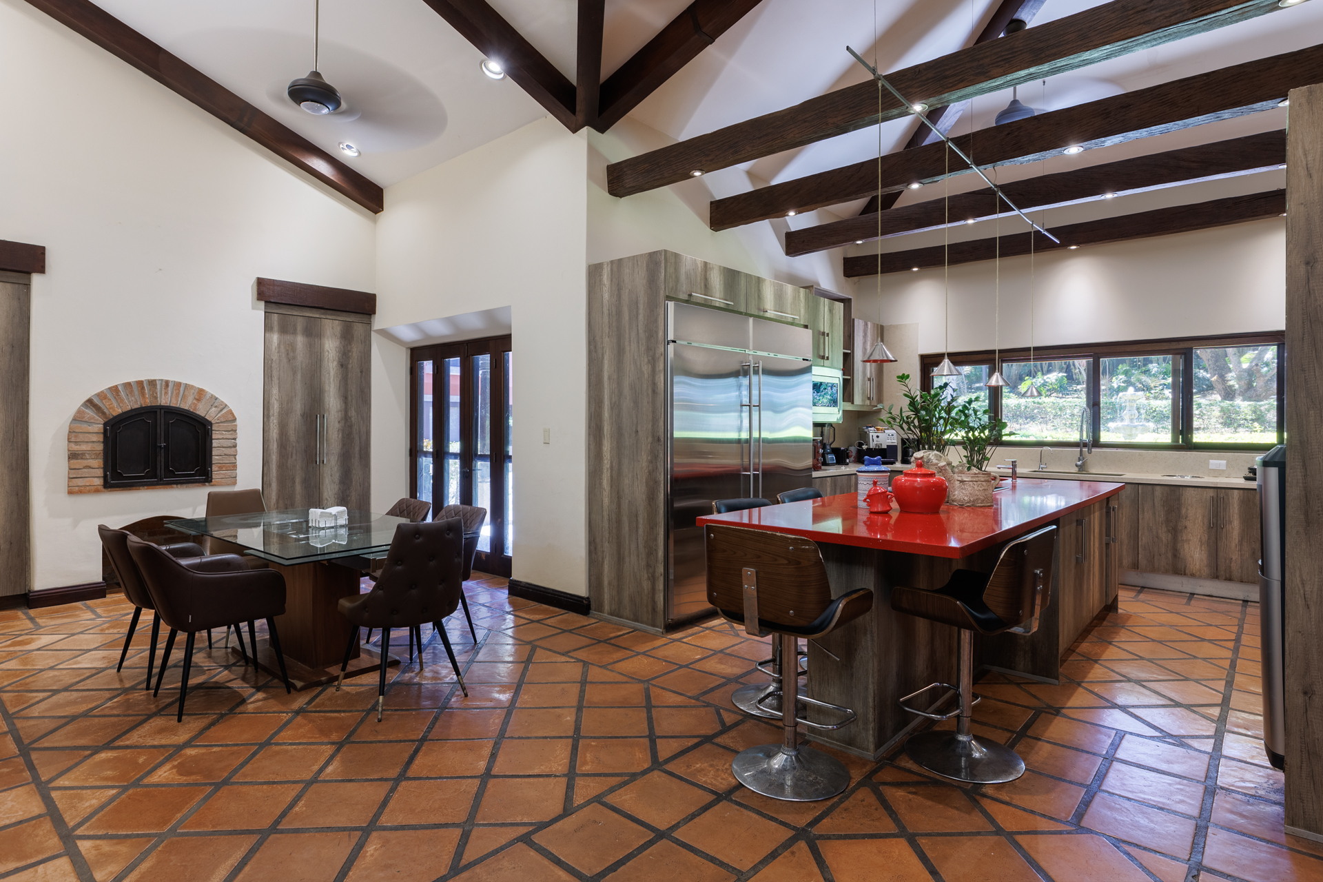The gourmet kitchen with an incorporated large breakfast area, blends rustic textures with contemporary utility, featuring wood cabinetry, granite countertops, a large island, and high-end appliances. Ideal for both family gatherings and entertaining, the kitchen is connected to the elegant formal dining area with gigantic windows and tranquil garden views.