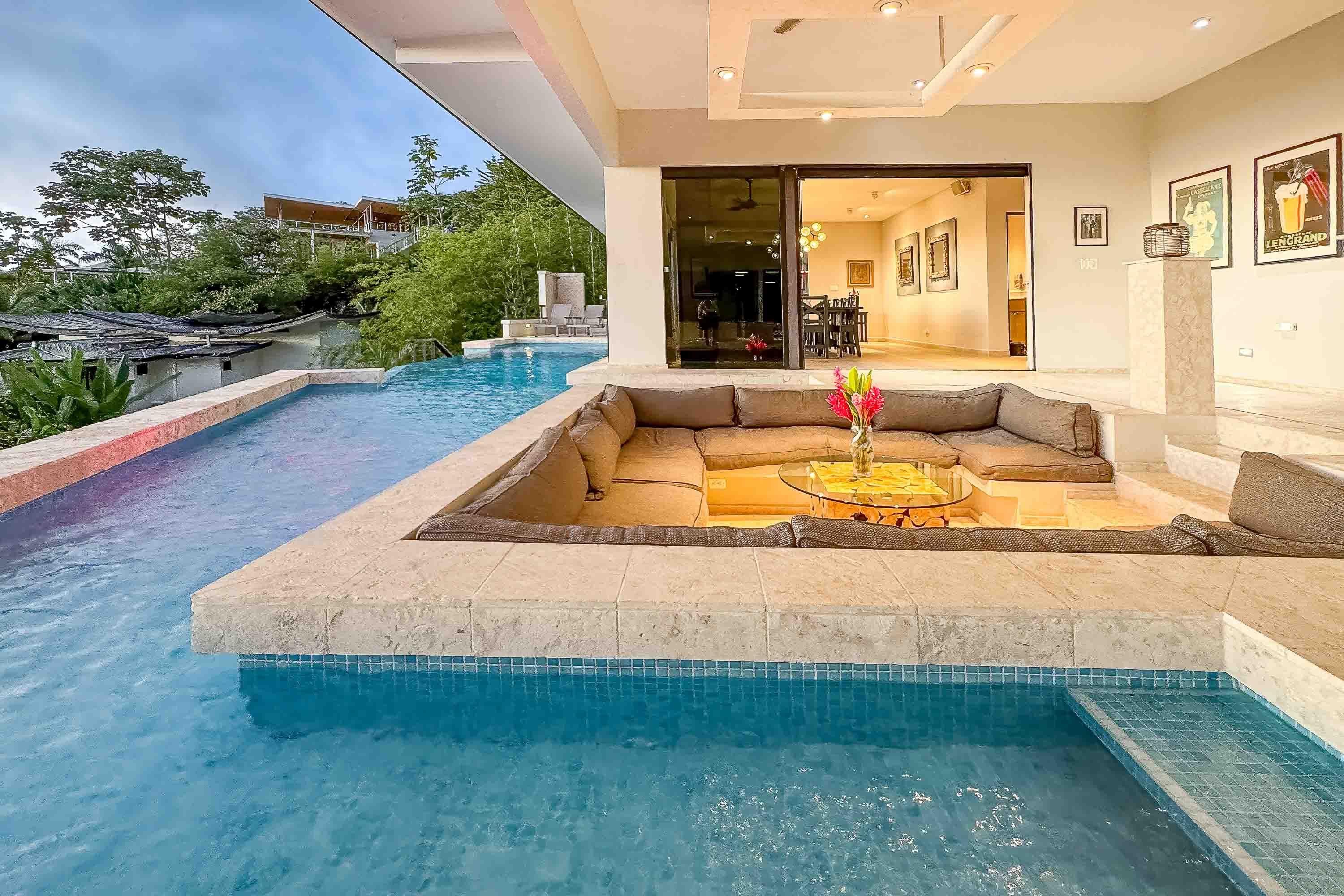 Inside, the villa is designed for both indulgence and effortless flow. Several of the home's bedrooms feature sweeping ocean panoramas and oversized, spa-inspired bathrooms. At the heart of the home sits a dramatic sunken living room wrapped entirely by the pool--an architectural showpiece that allows every guest a front-row seat to unforgettable sunsets. The expansive wraparound terrace, complete with a large built-in jacuzzi, creates a seamless connection between indoor elegance and open-air tropical living.
