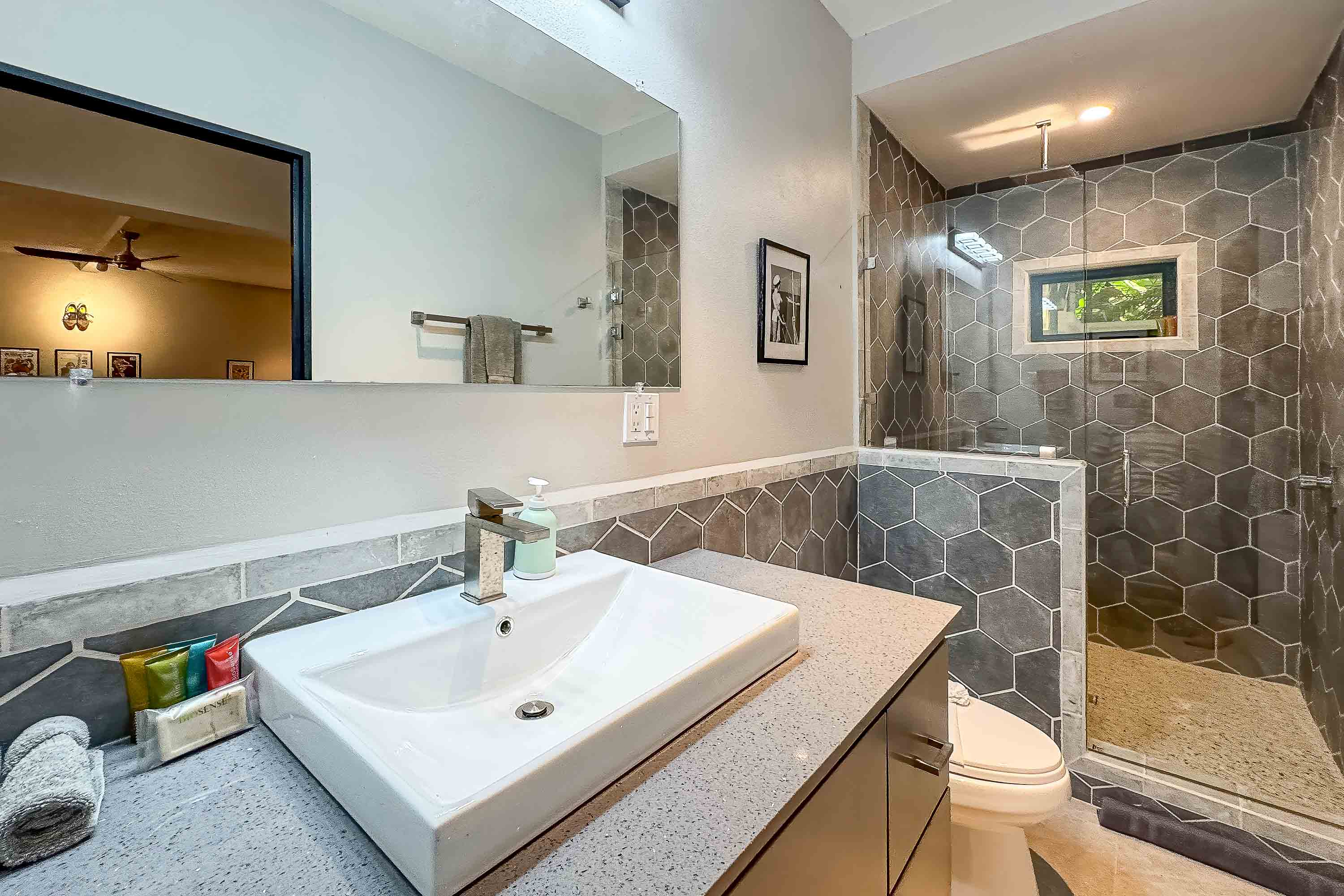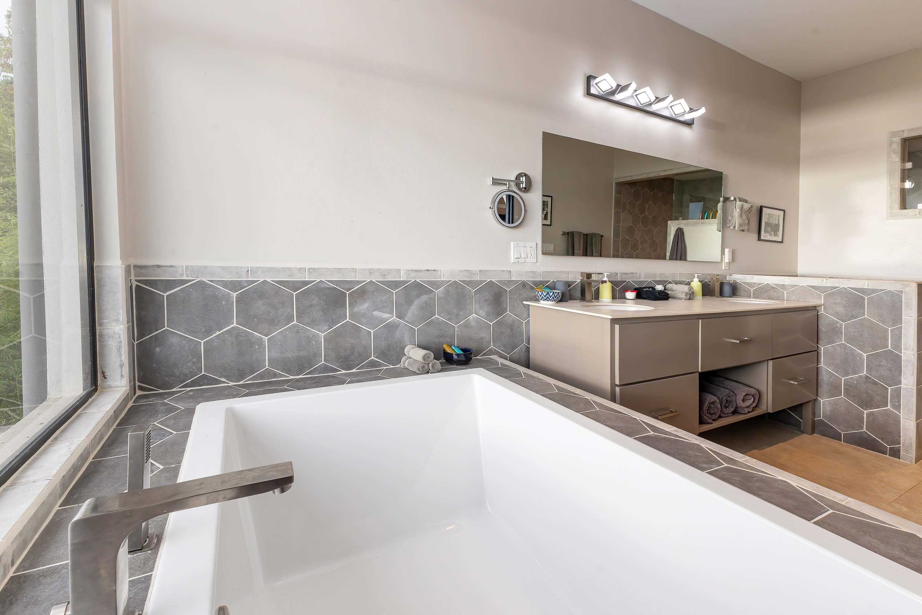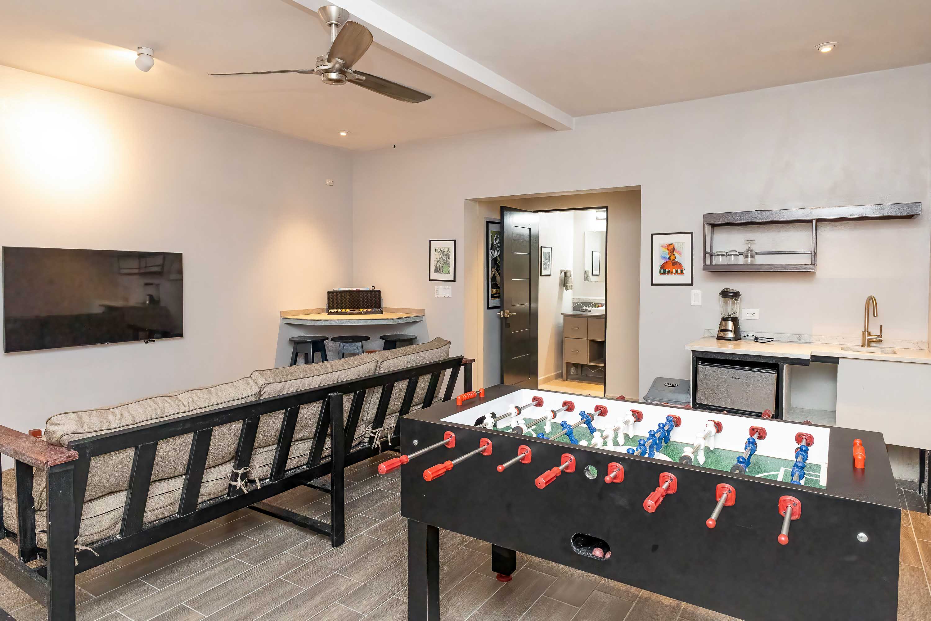 Entertaining here is a full sensory experience. The home features multiple social zones, including a full bar beside the massive 14-person hot tub, an impressive chef's kitchen designed for large gatherings, and an airy dining room that seats up to 14 guests in style. With three dedicated wet bars across the main social areas, the villa is purpose-built for celebrations, retreats, and high-yield vacation rental performance.