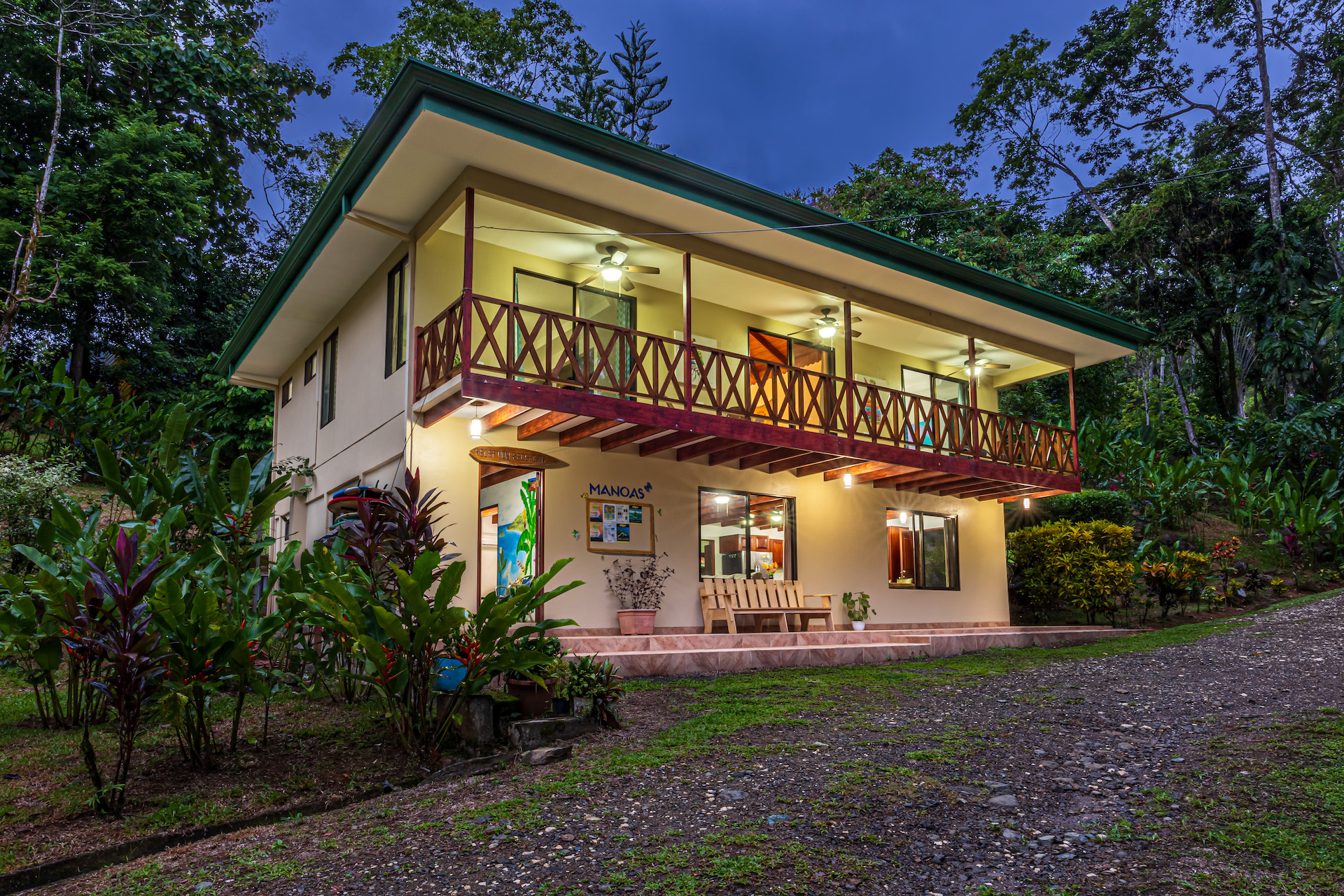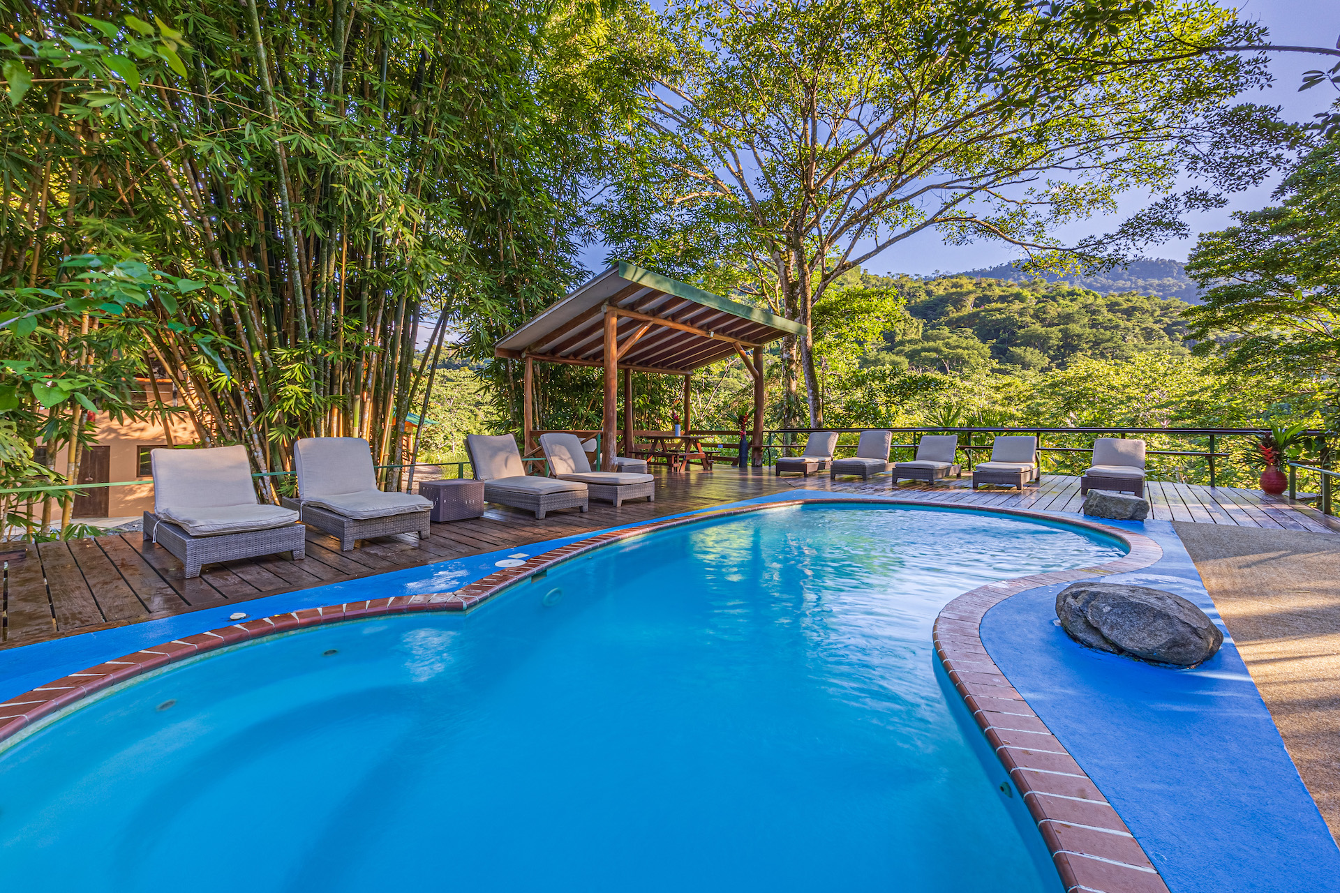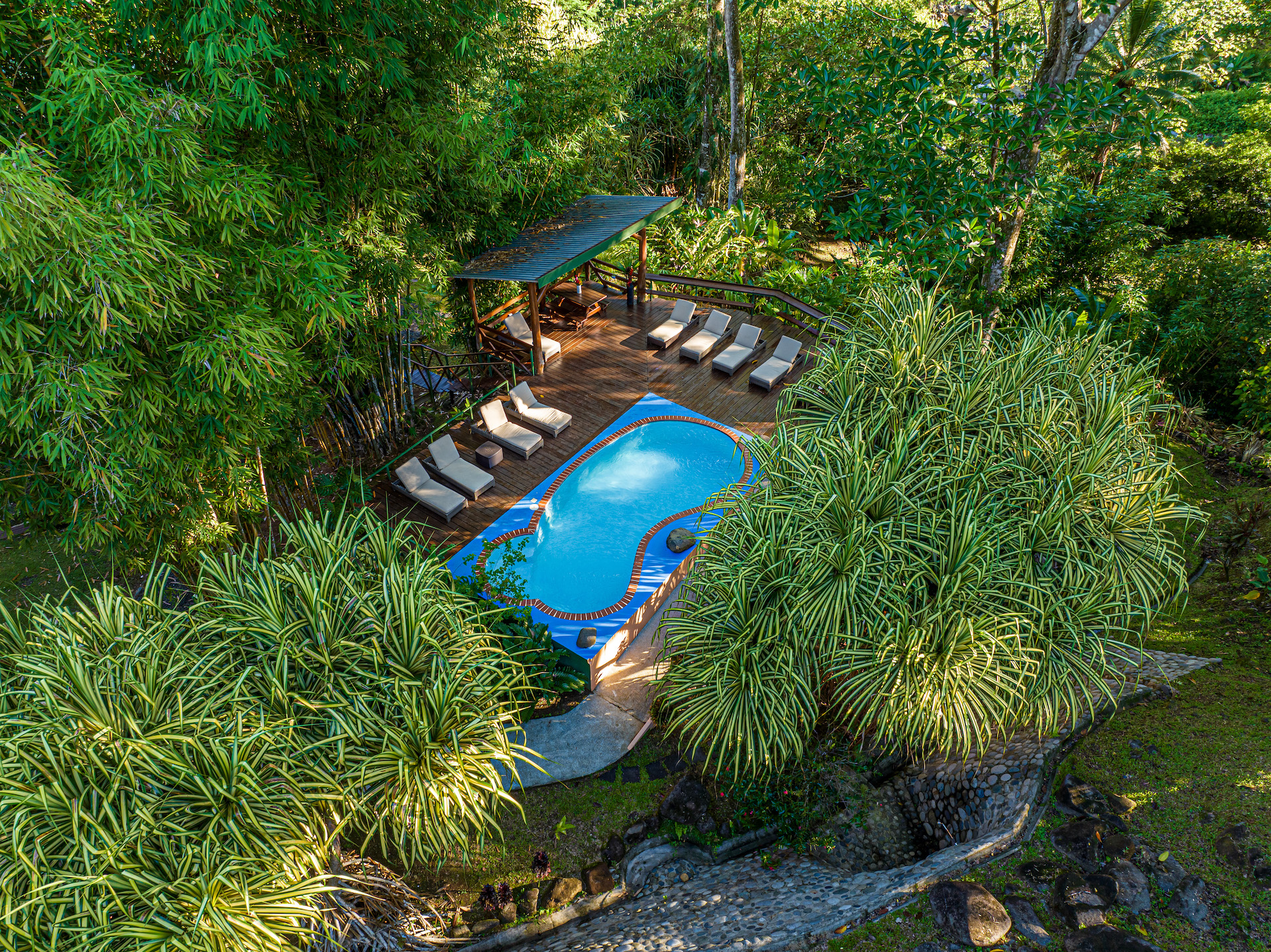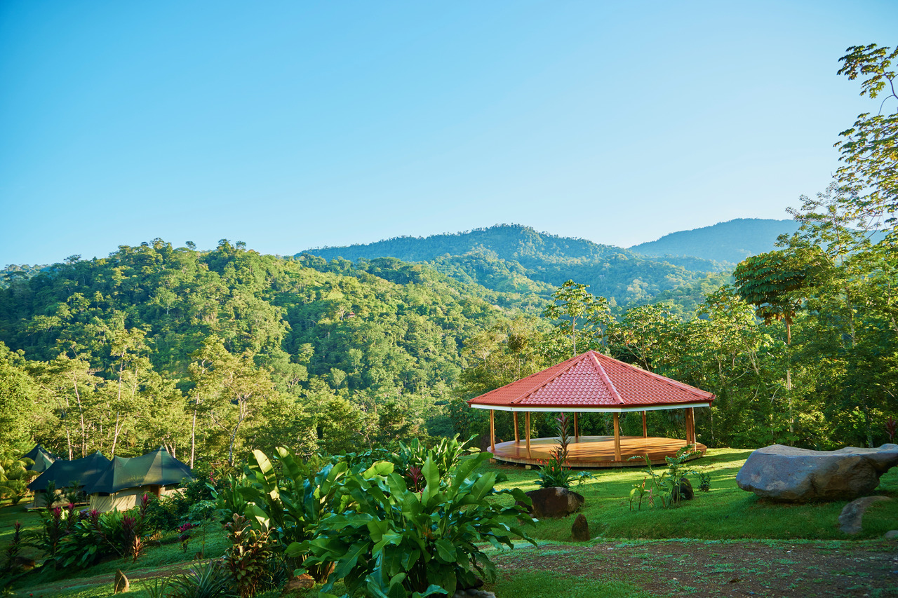 When it comes to a parcel of land with infrastructure and excellent reputation for co-existing with nature, Manoas is the respected property in the area. The large farm property has been transformed over the years to include several homes, Luxury safi tents, staff quarters, commercial kitchen and restaurant facility. A large open air yoga pavilion that is also the perfect setting for weddings and other events and ceremonies sits on the hillside with views to the jungle and towering mountains. The pool area with decking and covered rancho and the added advantage of river frontage with swimming holes and abundant wild life round out the property's additional gathering spaces for large groups.