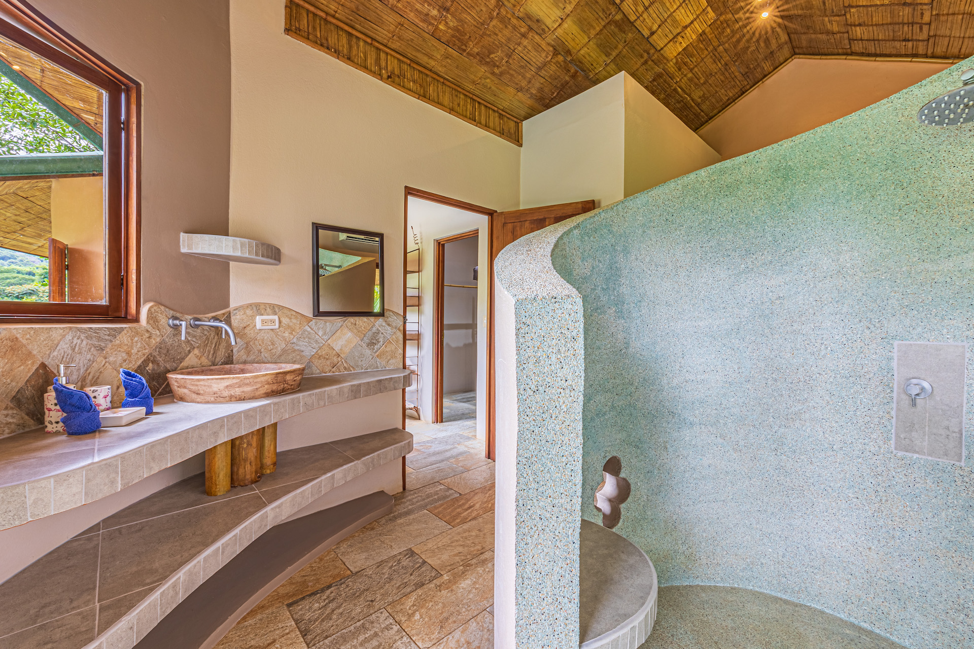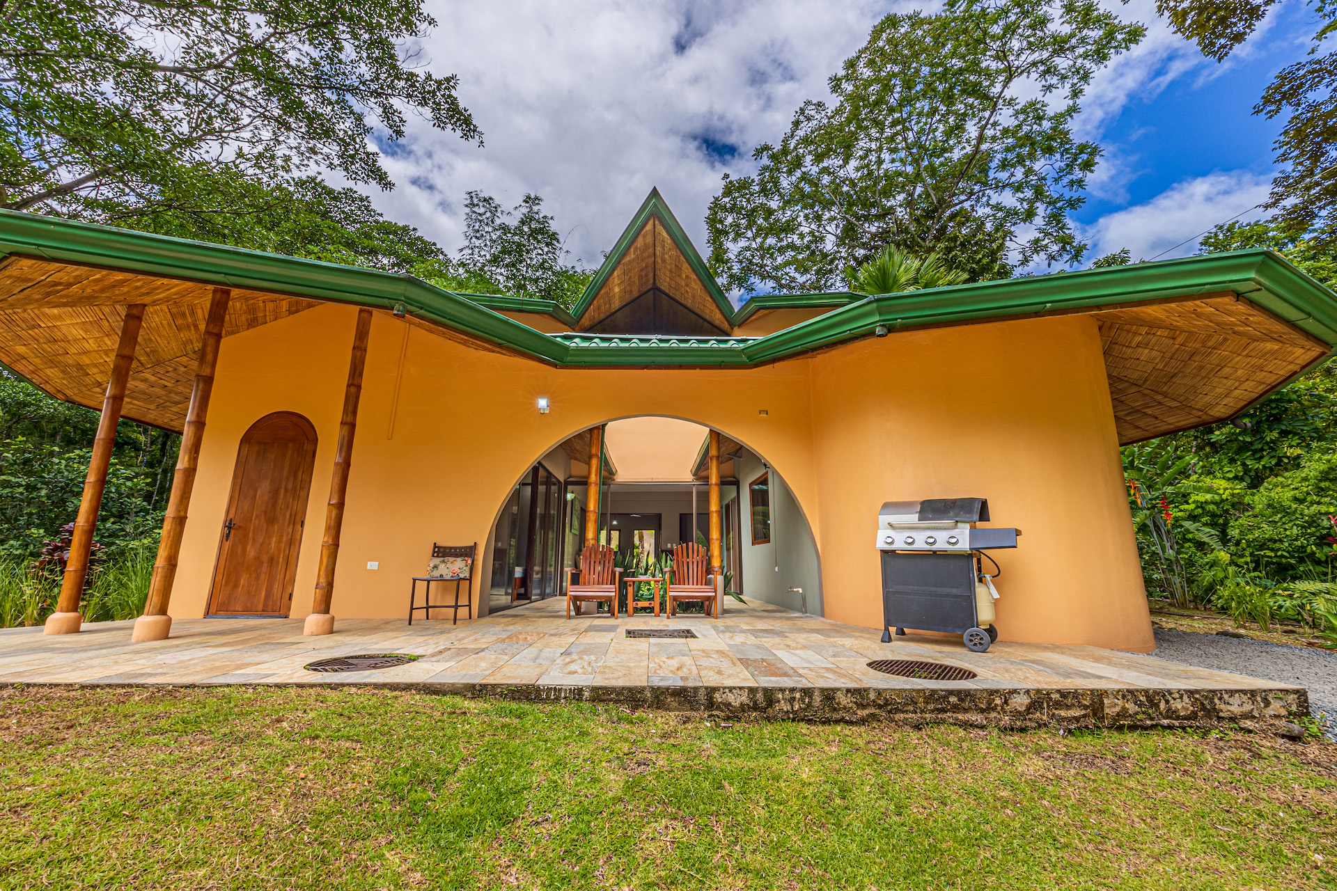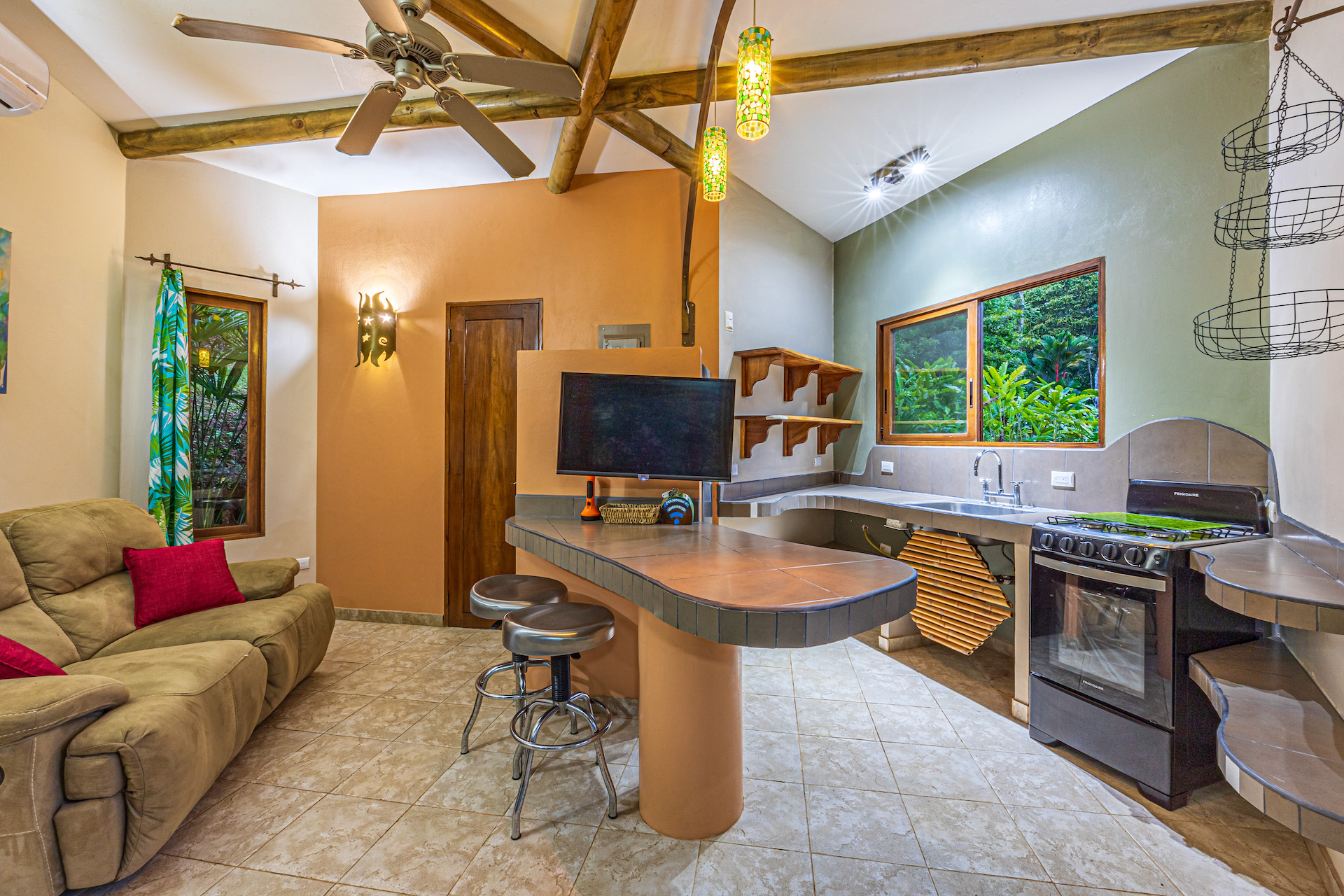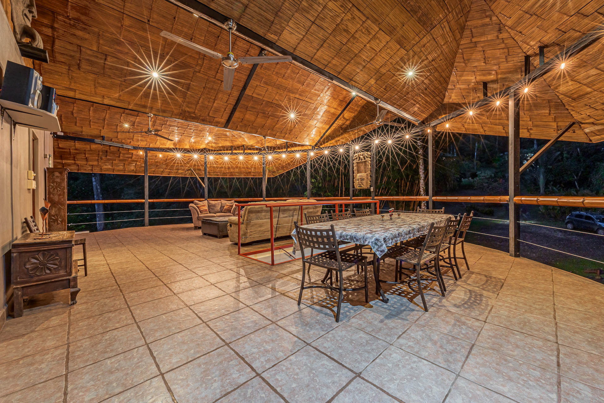 When it comes to a parcel of land with infrastructure and excellent reputation for co-existing with nature, Manoas is the respected property in the area. The large farm property has been transformed over the years to include several homes, Luxury safi tents, staff quarters, commercial kitchen and restaurant facility. A large open air yoga pavilion that is also the perfect setting for weddings and other events and ceremonies sits on the hillside with views to the jungle and towering mountains. The pool area with decking and covered rancho and the added advantage of river frontage with swimming holes and abundant wild life round out the property's additional gathering spaces for large groups.