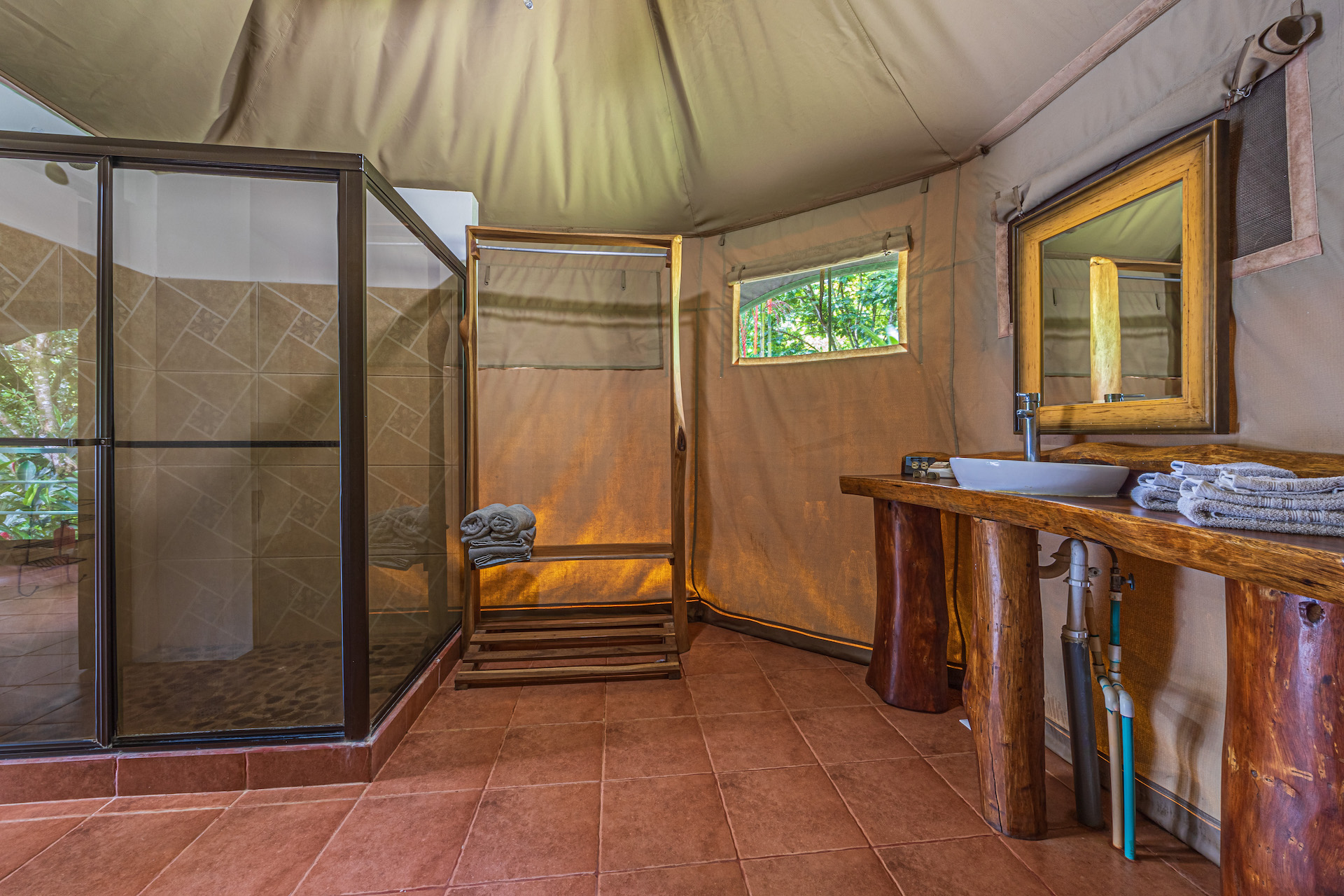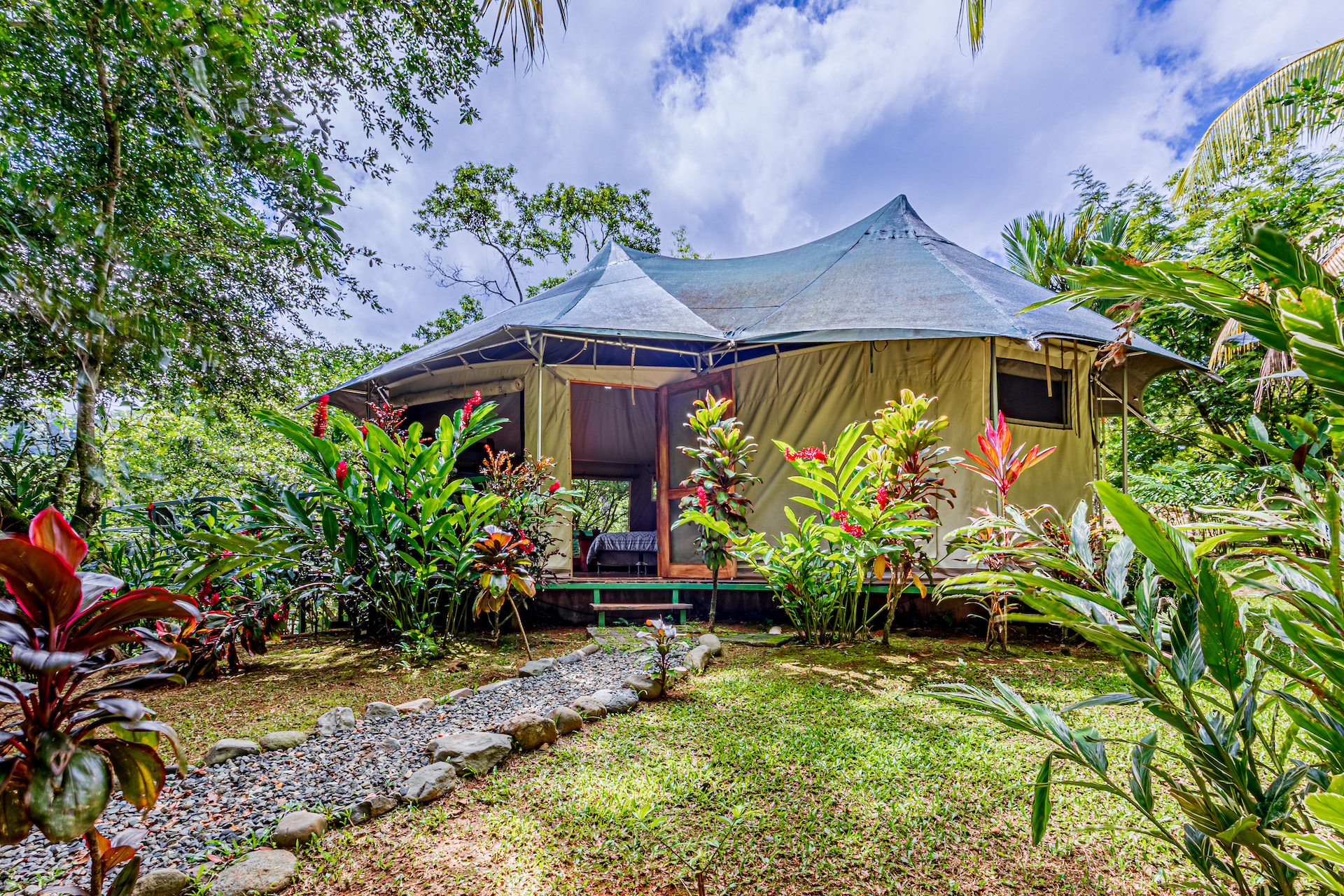 - 4 luxury Jungle Safari tents, each with beautiful ensuite baths, large exterior decking, and sleeping 2-4 people (425 sq ft each)
